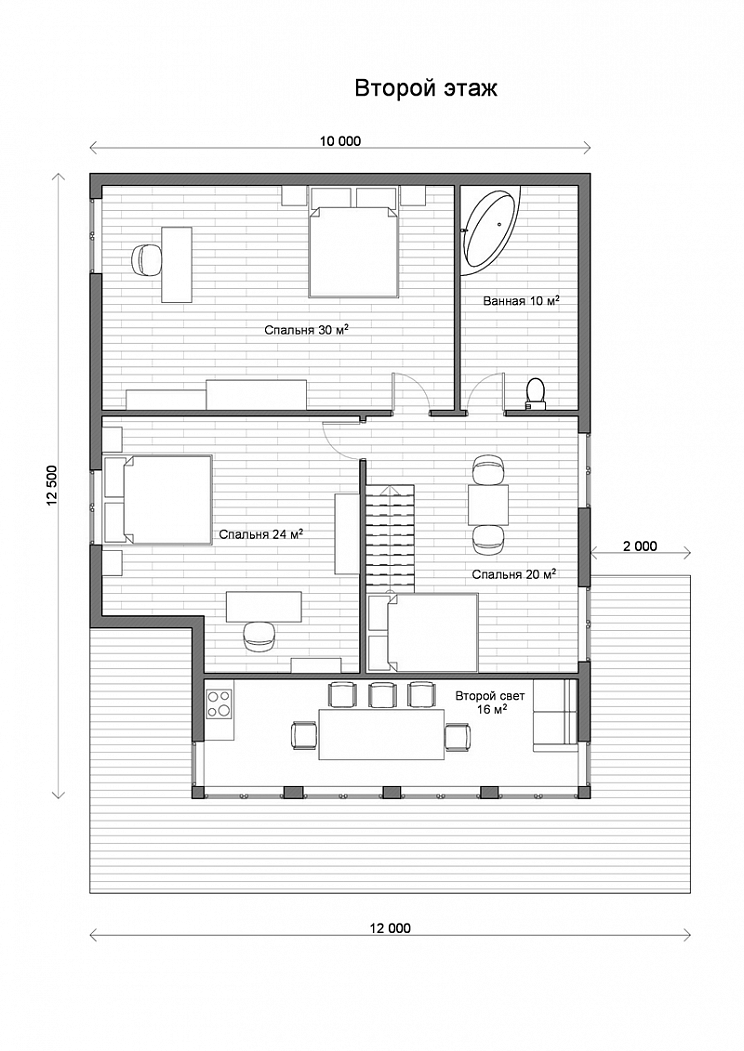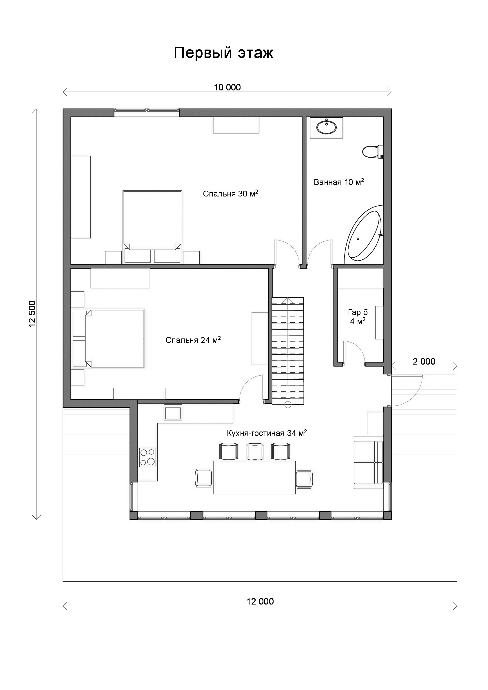 Простота форм – коробка в виде вытянутого прямоугольника, двускатная крыша, минималные свесы. Жесткий каркас из опорных клееных балок. Второй свет на всей протяженности или в одной из торцевых частей. Панорамное остекление, максимум свободного пространств.